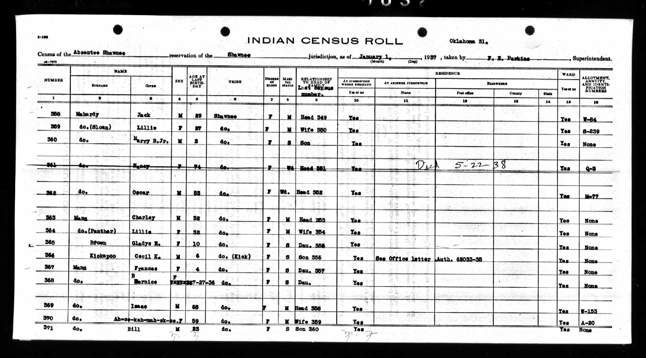 Absentee Shawnee according to the US Indian Rolls taken